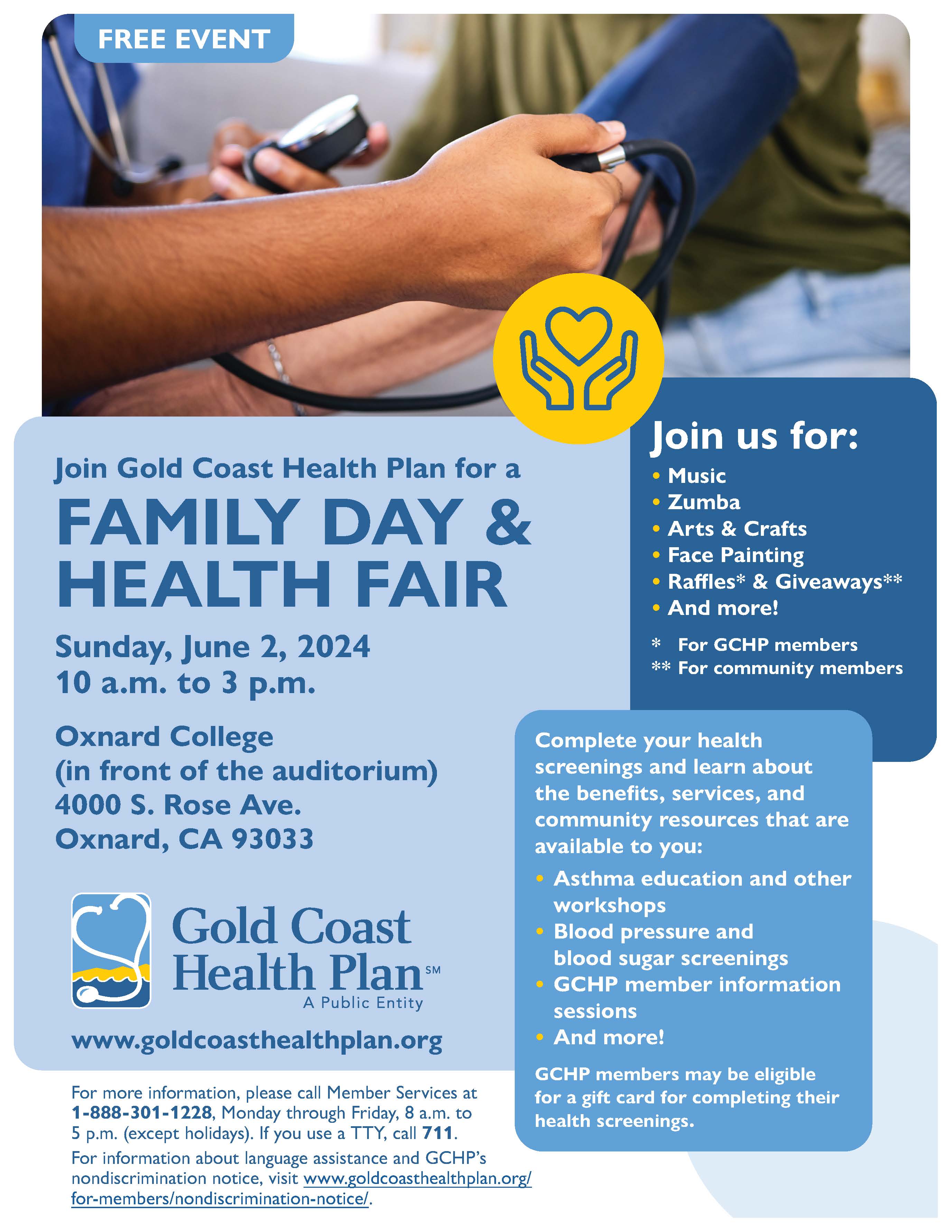 X-ALT-DESC;FMTTYPE=text/html:<p>Join Gold Coast Health Plan (GCHP) for music, raffles, health screenings, and more at GCHP's Family Day and Health Fair. GCHP staff will be on site to inform the community about the benefits, services, and community resources available.</p>